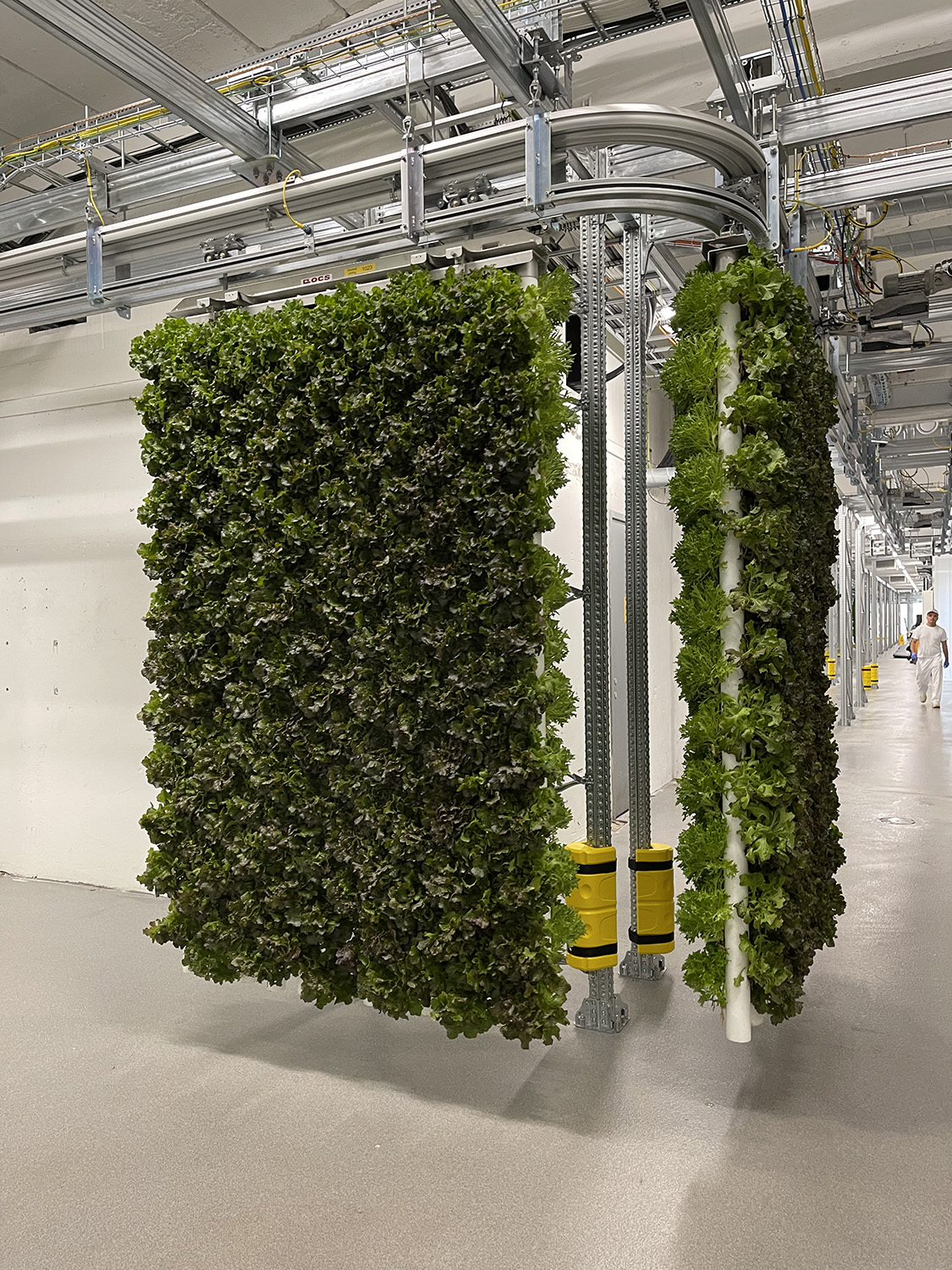 The system handles 48 wagons in each cultivation room and a total of 672 pipes are harvested every day. The carriages are positioned in such a way that irrigation is possible from above the pipes. Lighting and ventilation are integrated with the conveyor system. At maximum capacity, the system holds approximately 300,000 plants.