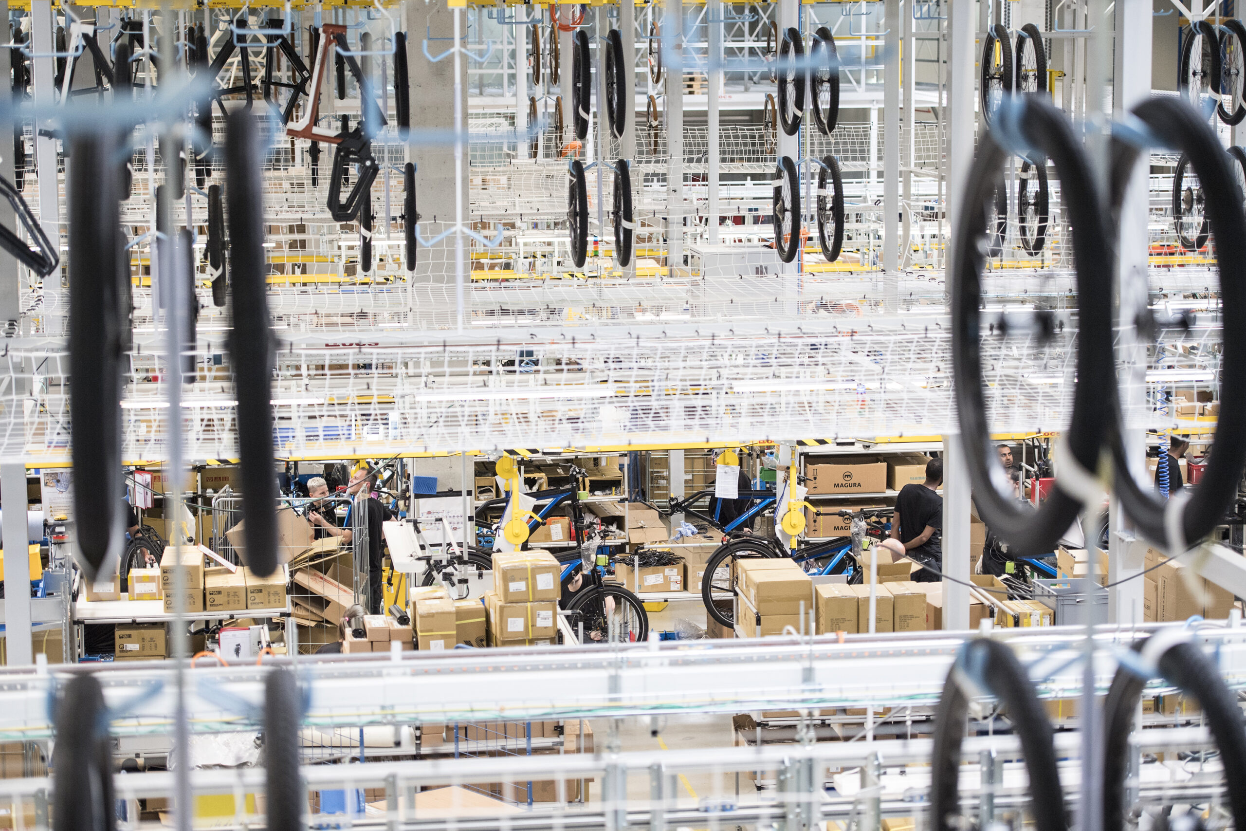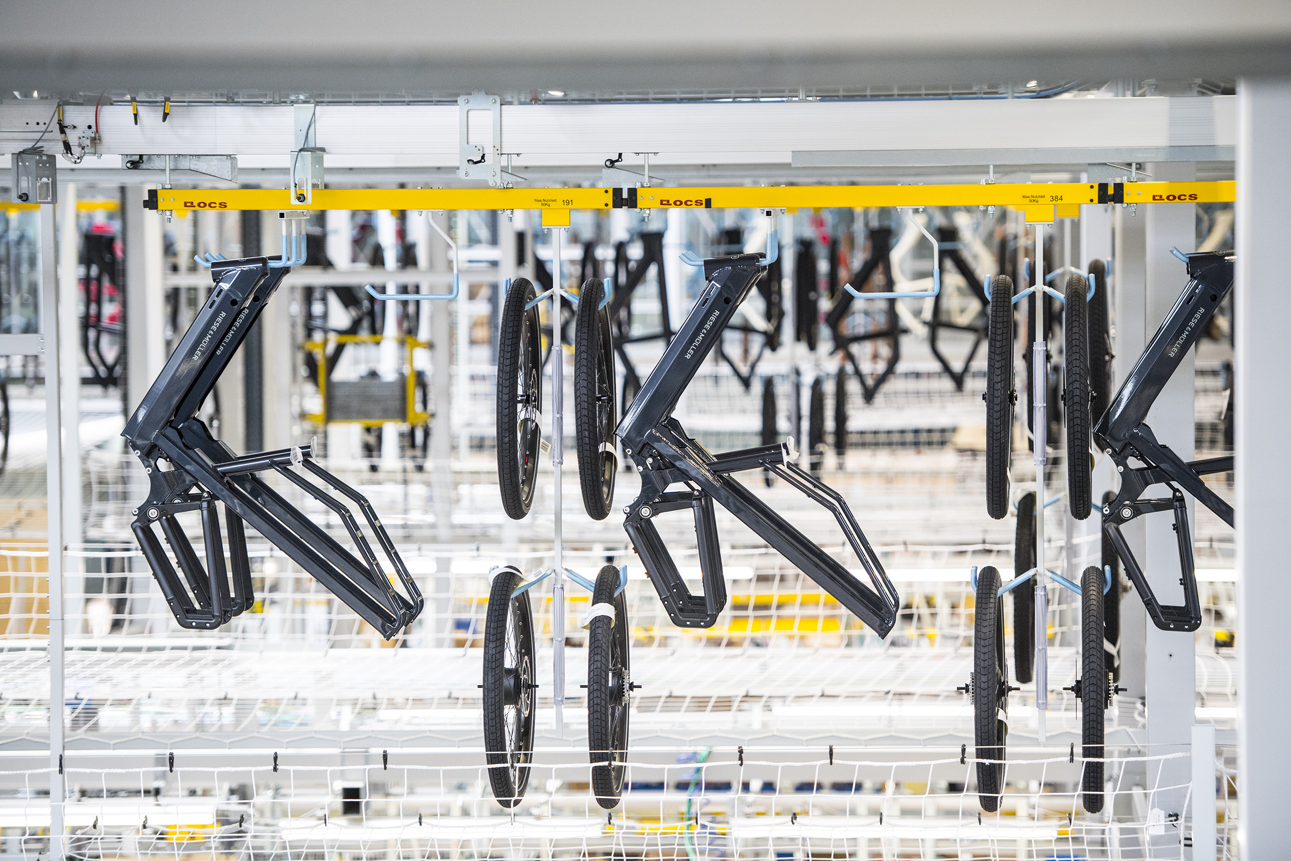 A RFID tag is fixed to each OCS trolley which ensures a clear identification of both trolley and product. The OCS Heavy Duty system is used for transport within the assembly of bicycles. The system is designed without a drive and in each case as a mounting loop. There are five assembly loops for e-bikes and one assembly loop for cargo bikes. The OCS Medium Duty system is used to transport frames and wheels. There is only one product carrier in the system for both products. Vertical conveyors transports the components down to the assembly loops.