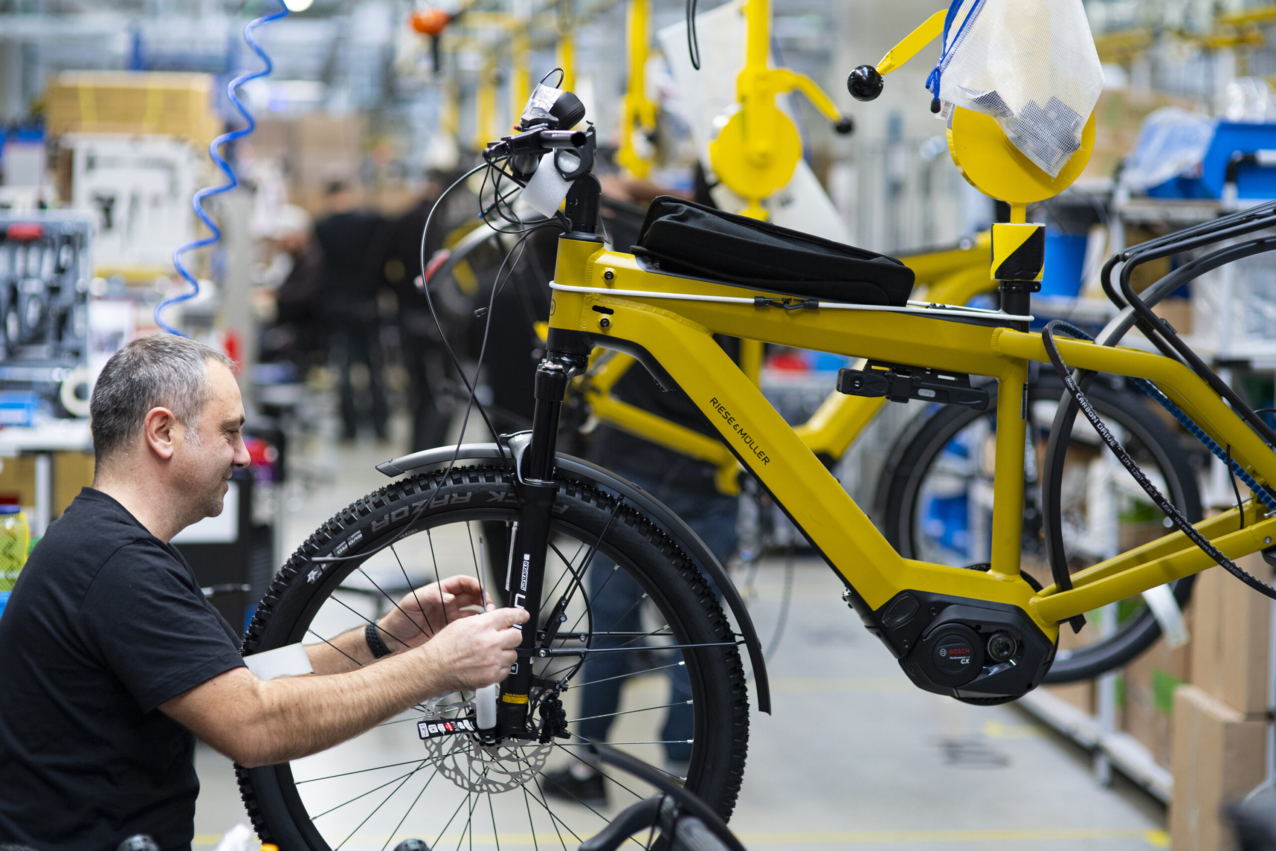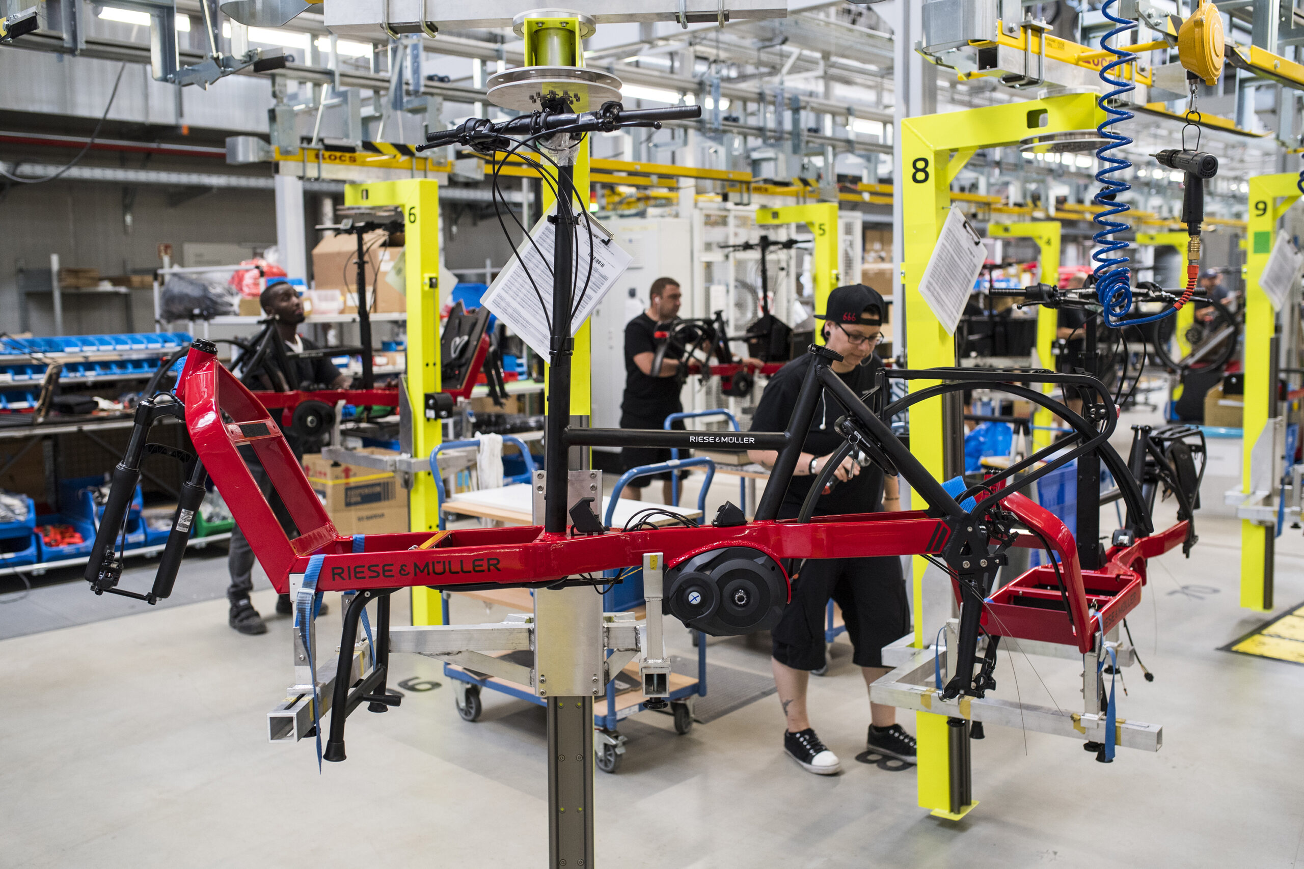 As part of planning a new building, Riese & Müller wanted to bring its production up to the latest level of technique. After visiting other bike-manufacturers with OCS installations installed, Riese & Müller contacted us to discuss the different solutions and possibilities for bike-assembling using an OCS Overhead Conveyor System.